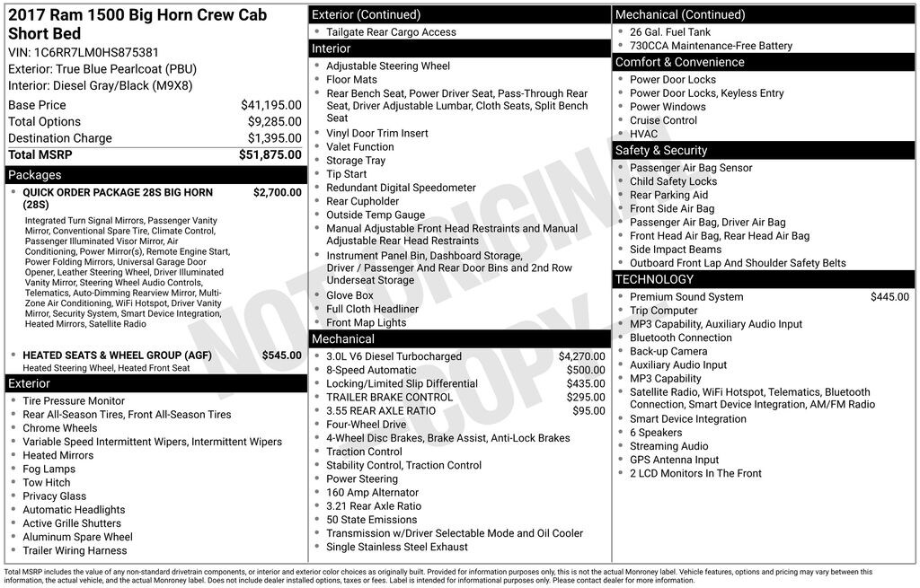 This 2017 Ram 1500 Big Horn comes equipped with a powerful yet efficient 3.0L EcoDiesel V6 engine paired with an 8-speed automatic transmission and capable 4-wheel drive system. Key features include: